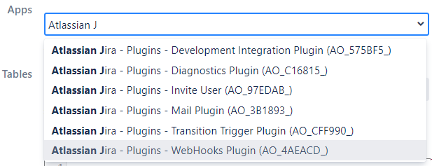 - One entries for each plugin with Active Objects : Plugin Name (AO_123456_) .