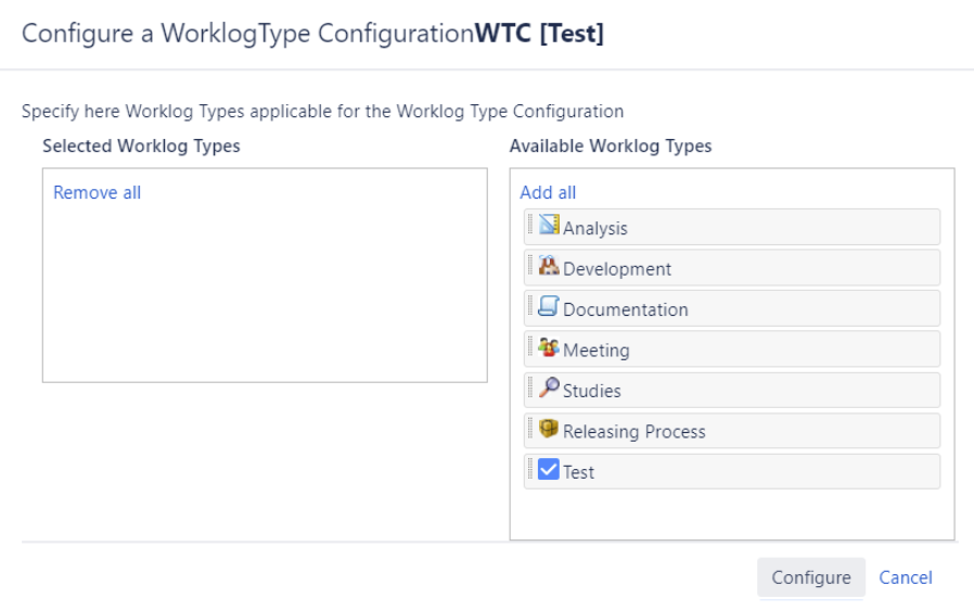 You will be able to select relevant Worklog Types by dragging them from Available Worklog Types column to Selected Worklog Types column ...