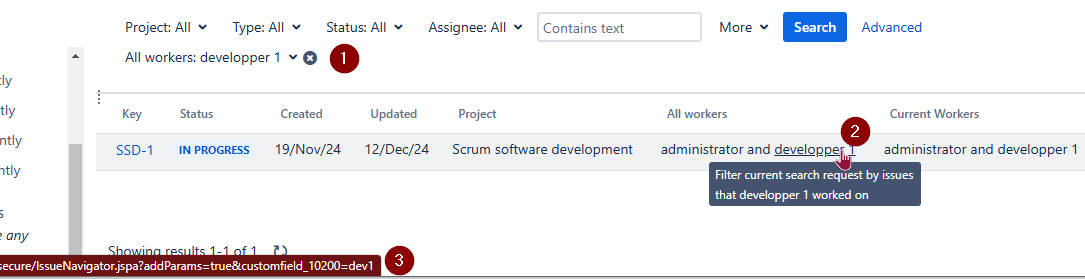 ... and from the resulting list of found issues, you can navigate to the issues worked on the identified workers.