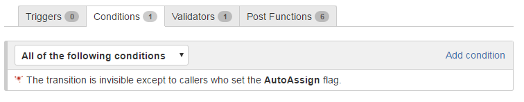 Now, the condition is valid, only if the flag AutoAssign is present in arguments ... It can have been passed by one of Minyaa Post-Function, but also in a dedicated development as Initiator (JIRA Service, Listener, ...)
