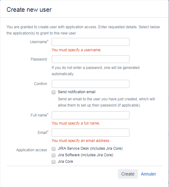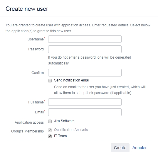 Depending on which Delegation of Create User Permissions you are granted and on how Group Delegations are defined, a Create User screen, similar as the JIRA Administrator, will be displayed :