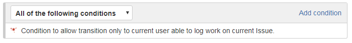This Workflow Condition allows to evaluate if the current User is allowed to Log Work on the Issue, not only depending on Work On Issue permission, but also depending Minyaa Time rules.