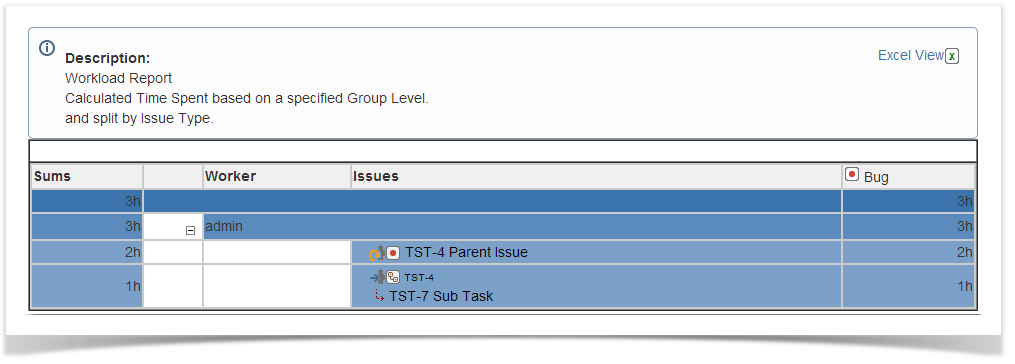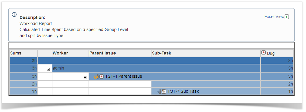 - Their related Worklogs are displayed depending each Issue Type column (Separate columns for Parent Issues and Sub-Task )