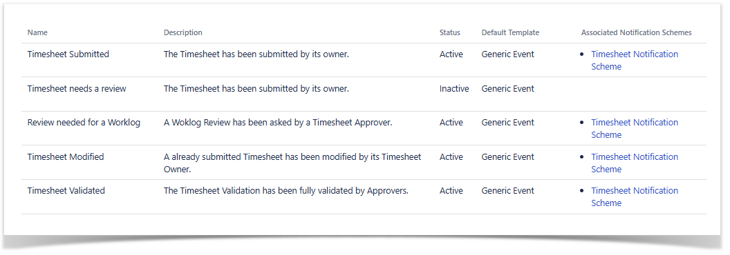 Some event are added in the configuration and associated to new Mail Template.Workflow for Timesheets